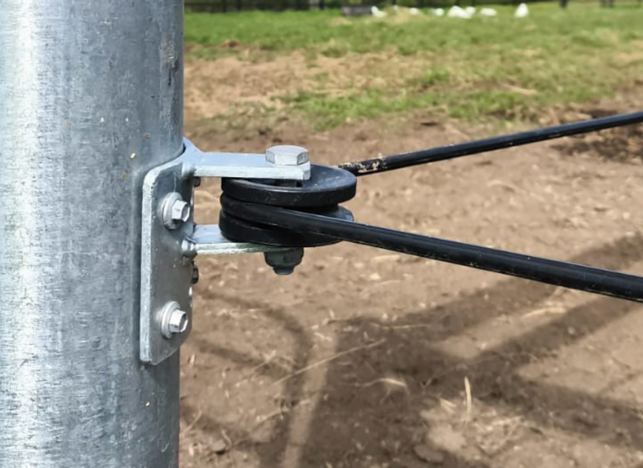 Insulated heavy-duty galvanised corner roller for attachment to timber or steel to allow the wire to continuously run around bends of over 45 degrees.