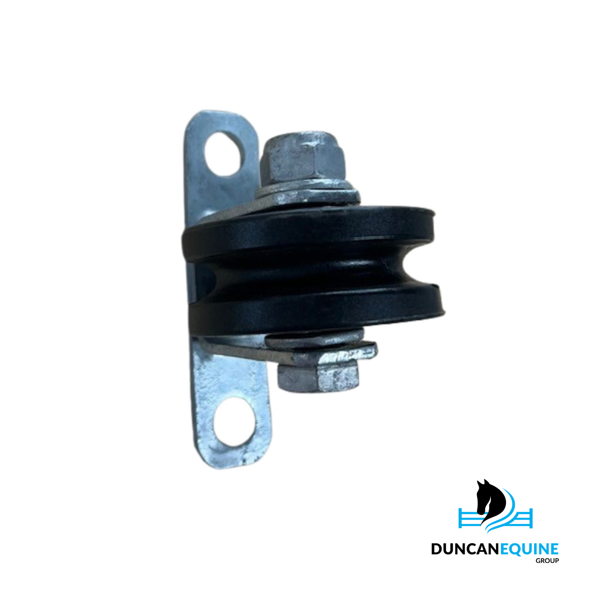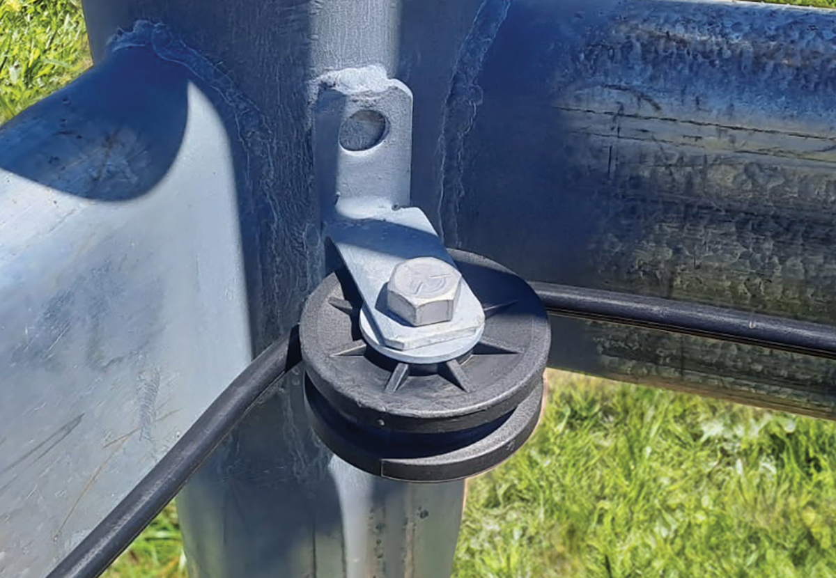 Insulated heavy duty galvanised weld on corner roller for attachment to timber or steel to allow the wire to continuously run around bends of over 45 deg.